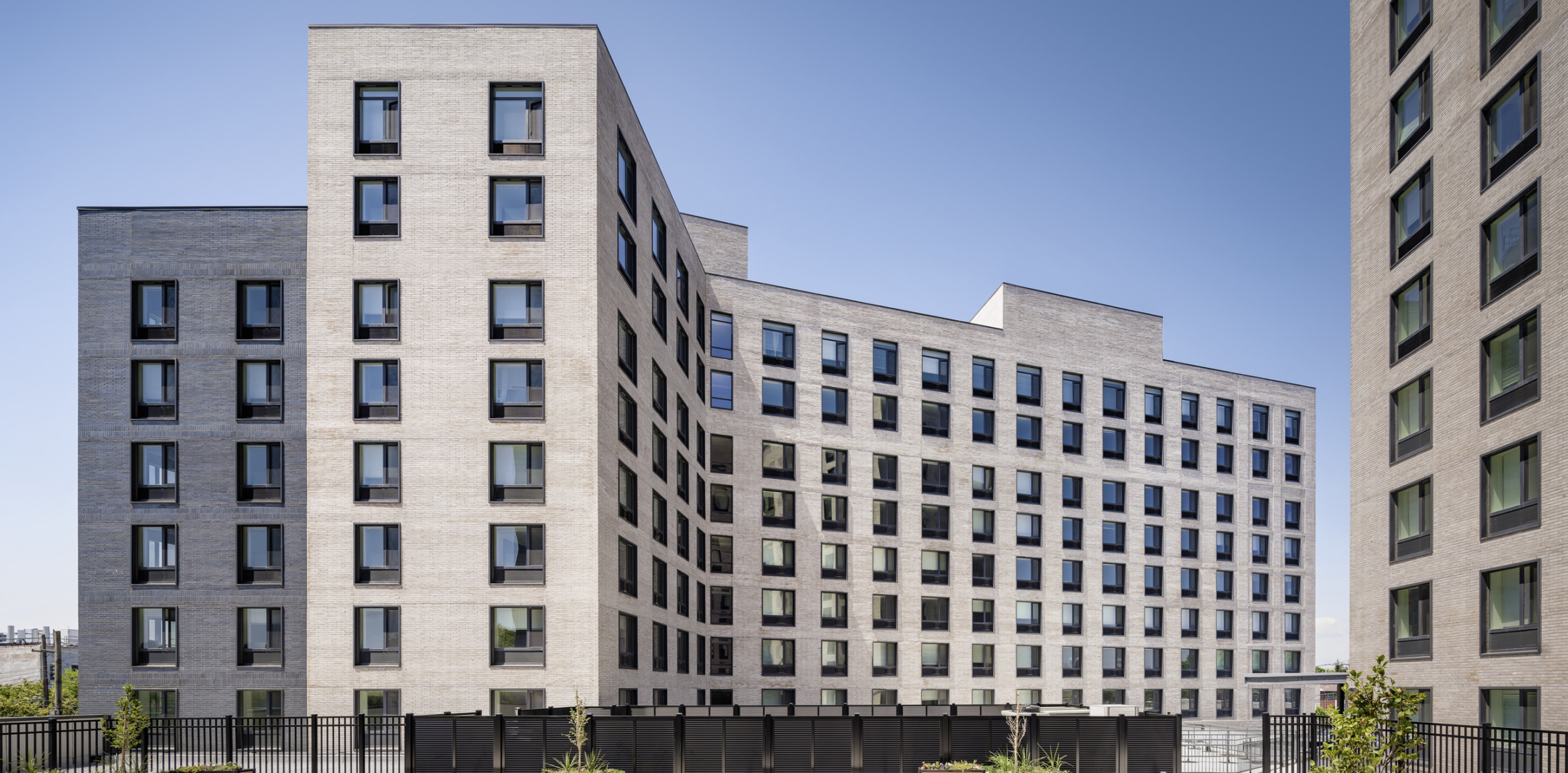 Ebenezer Plaza in Brownsville, Brooklyn, is emblematic of this notion, where land owned by Ebenezer Baptist Church was repurposed to provide four towers on two city blocks. The residences support a new community facility for the church, a rooftop terrace, and plentiful ground-floor retail space.