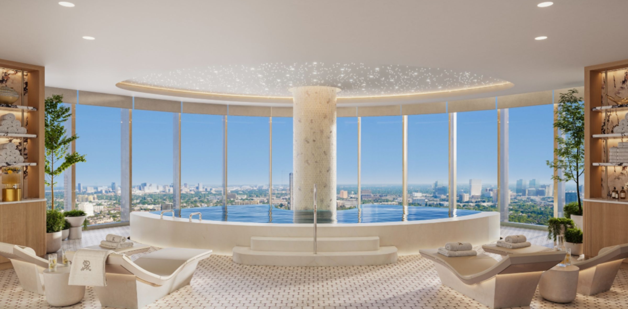 Health, wellness, and longevity programming are taking center stage in hospitality spa designs like this hot-plunge pool lounge planned for the St. Regis Residences, Houston. Renderings © ForrestPerkins