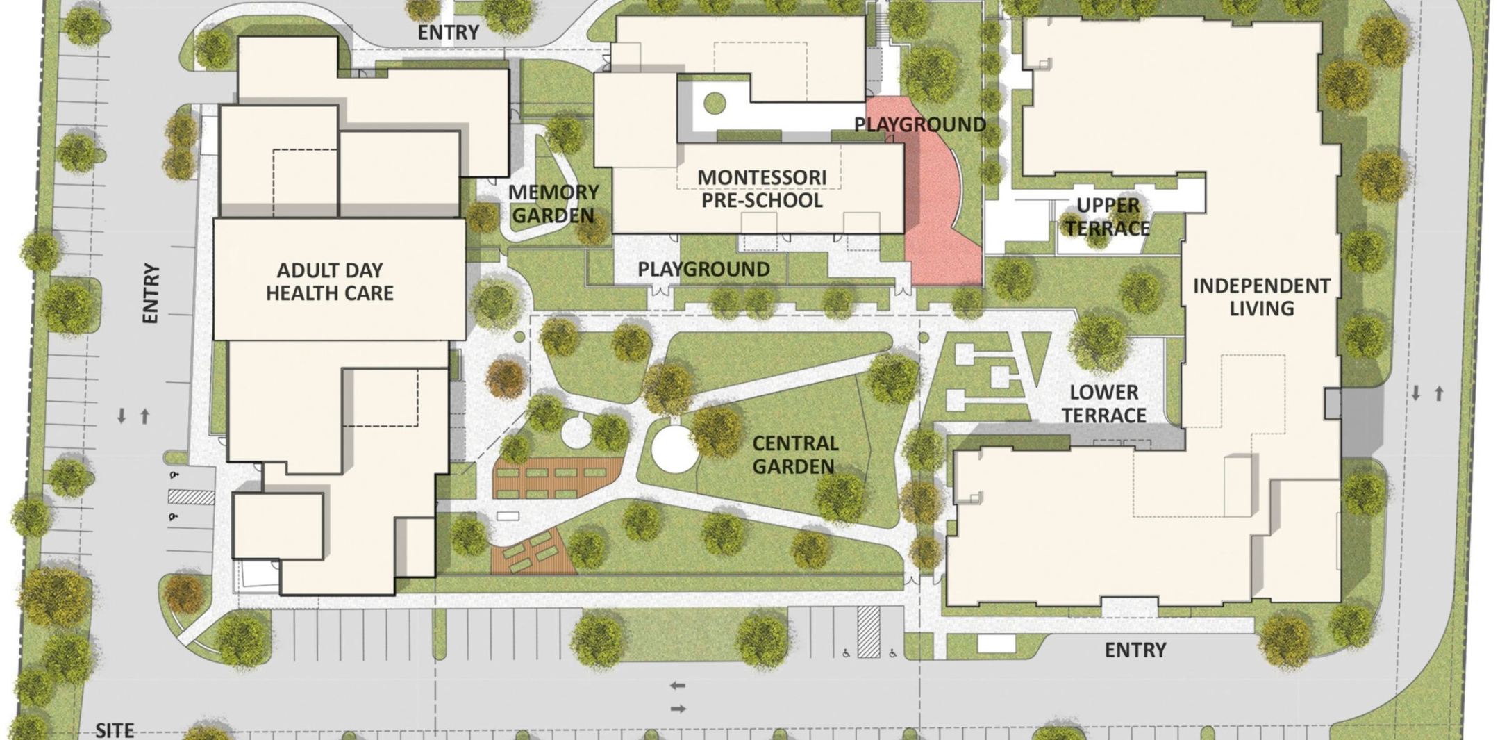 Clients are also driving the shift toward intentional intergenerational master planning. In one such project, Perkins Eastman is currently leading the master planning and design for Choice in Aging in Pleasant Hill, CA, a nearly 175,000-square-foot campus that co-locates a Montessori school with adult day care and senior housing, creating opportunities for daily interaction across age groups. Having witnessed the delight that emerges when young children and memory care residents engage with one another, the client requested that these programs be housed adjacent to each other with a central memory garden providing opportunities for shared experiences.