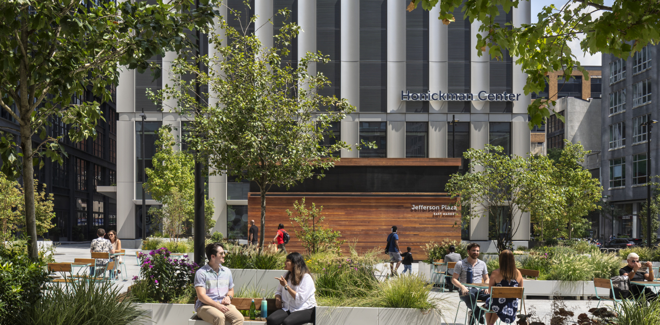 One such project, Jefferson Plaza, offers 20,000 square feet of vibrant, landscaped public space in Philadelphia’s East Market neighborhood. The plaza’s seating, tables, public art, and pavers replaced a parking garage structure—a barrier to street life—but that doesn’t mean the car park is gone. Our design team moved it underground, freeing street-level space for active, human-centered use.