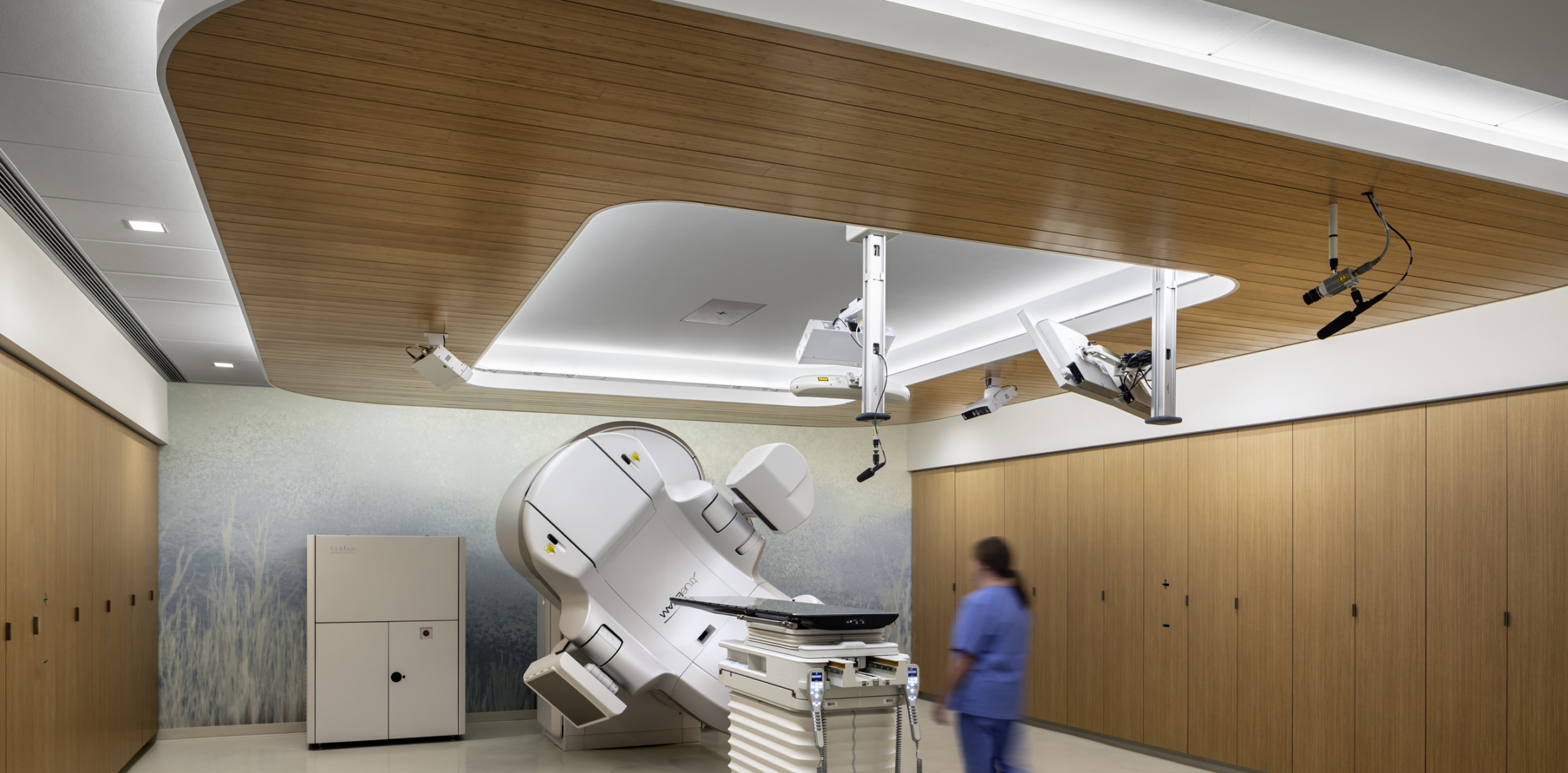 The client prioritized two design objectives for its patients and staff. The first one was to accommodate a multidisciplinary treatment and consultation platform where the medical, surgical, and radiation oncology teams come together to discuss a treatment plan in one space, sparing patients and their families from moving between exam rooms. Knowledge puts patients in control of their healthcare, so it is important for their teams to make decisions together. The second objective was to create a calm and uplifting environment while providing the most advanced treatments.