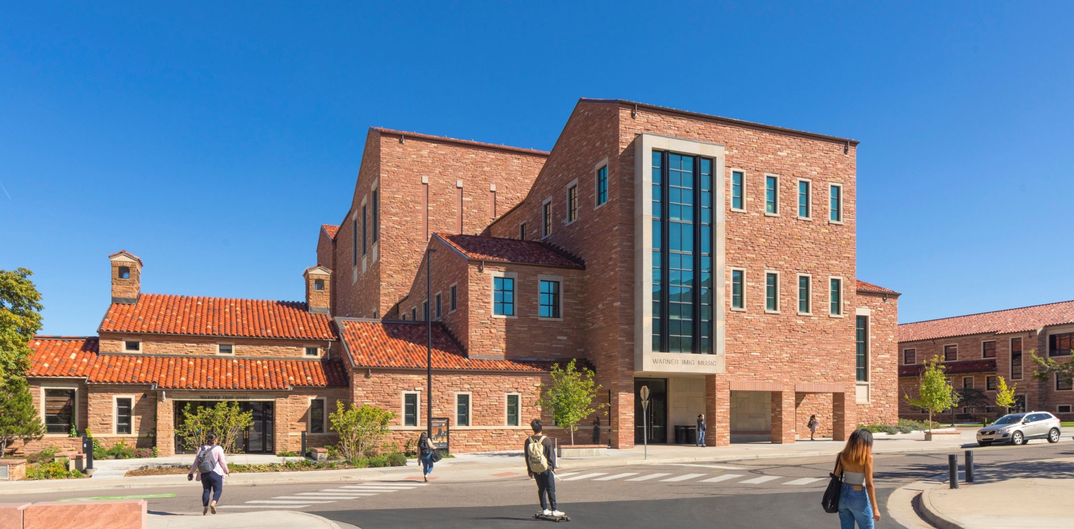 The Warner Imig Music Building at the University of Colorado, Boulder is a faithful realization of Principal Alberto Cavallero’s early concept sketch. Photograph © Paul Brokering