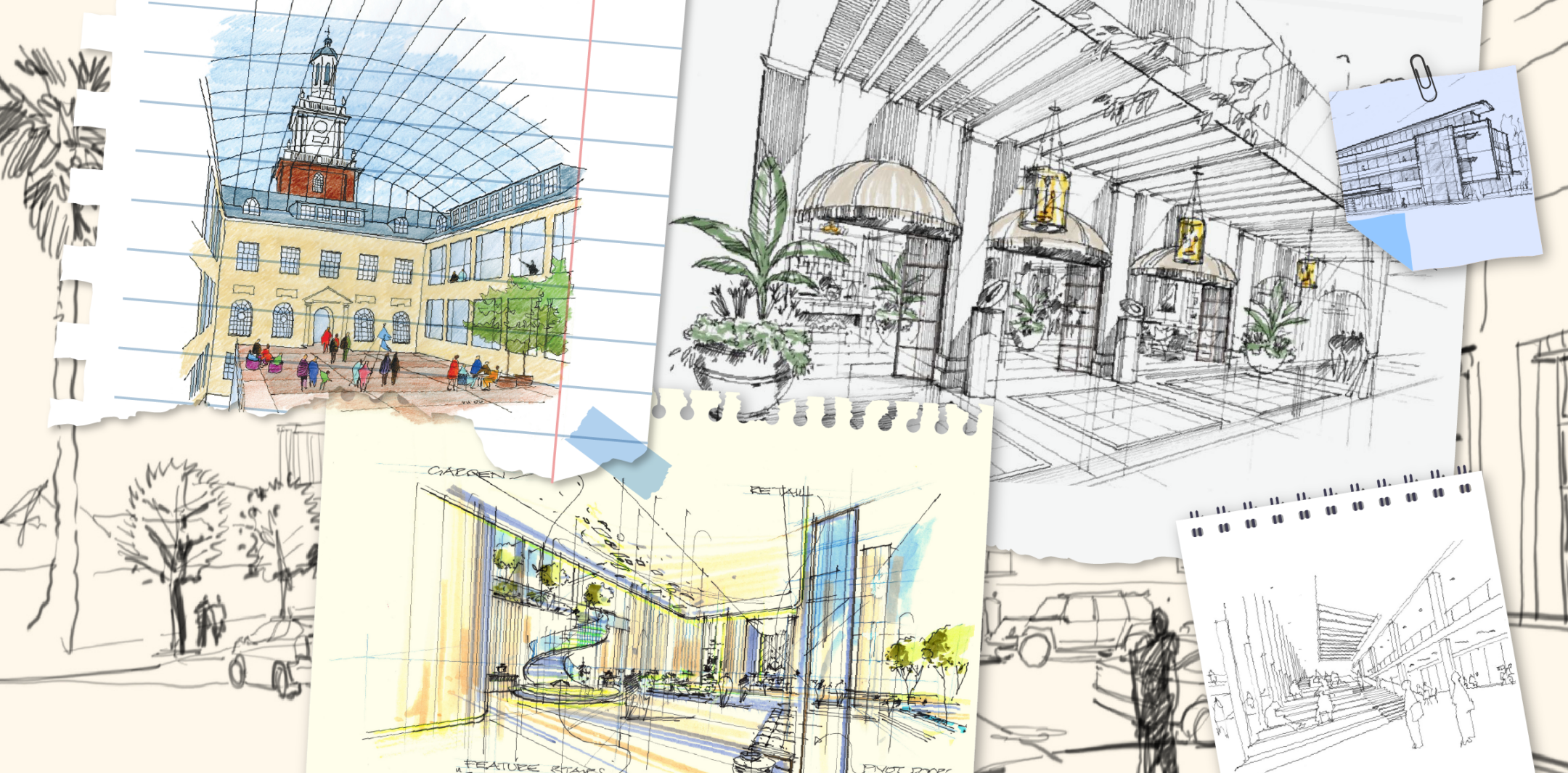Hand-drawn sketches by our staff members are fundamental to the digital design work that follows. All sketches and graphics © Perkins Eastman
