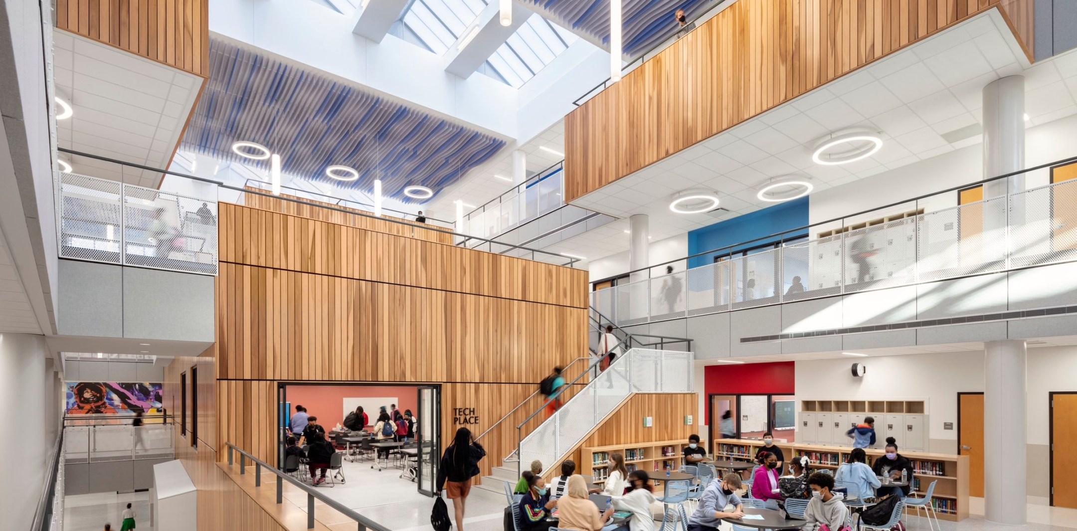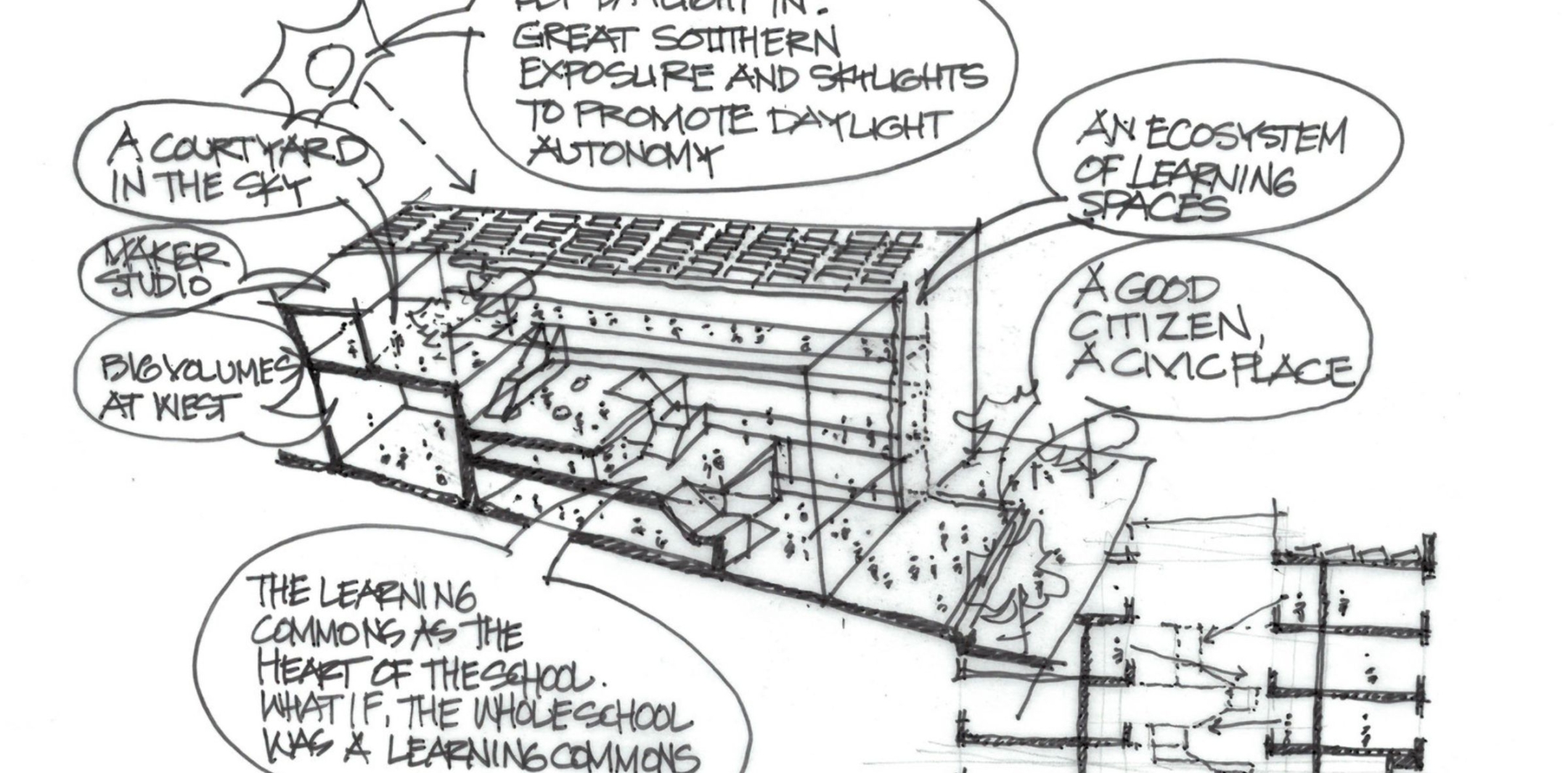 The finished building embodies the concepts illustrated in Principal Omar Caldéron Santiago’s early design sketch of Benjamin Banneker Academic High School in Washington, DC. Photograph © Joseph Romeo