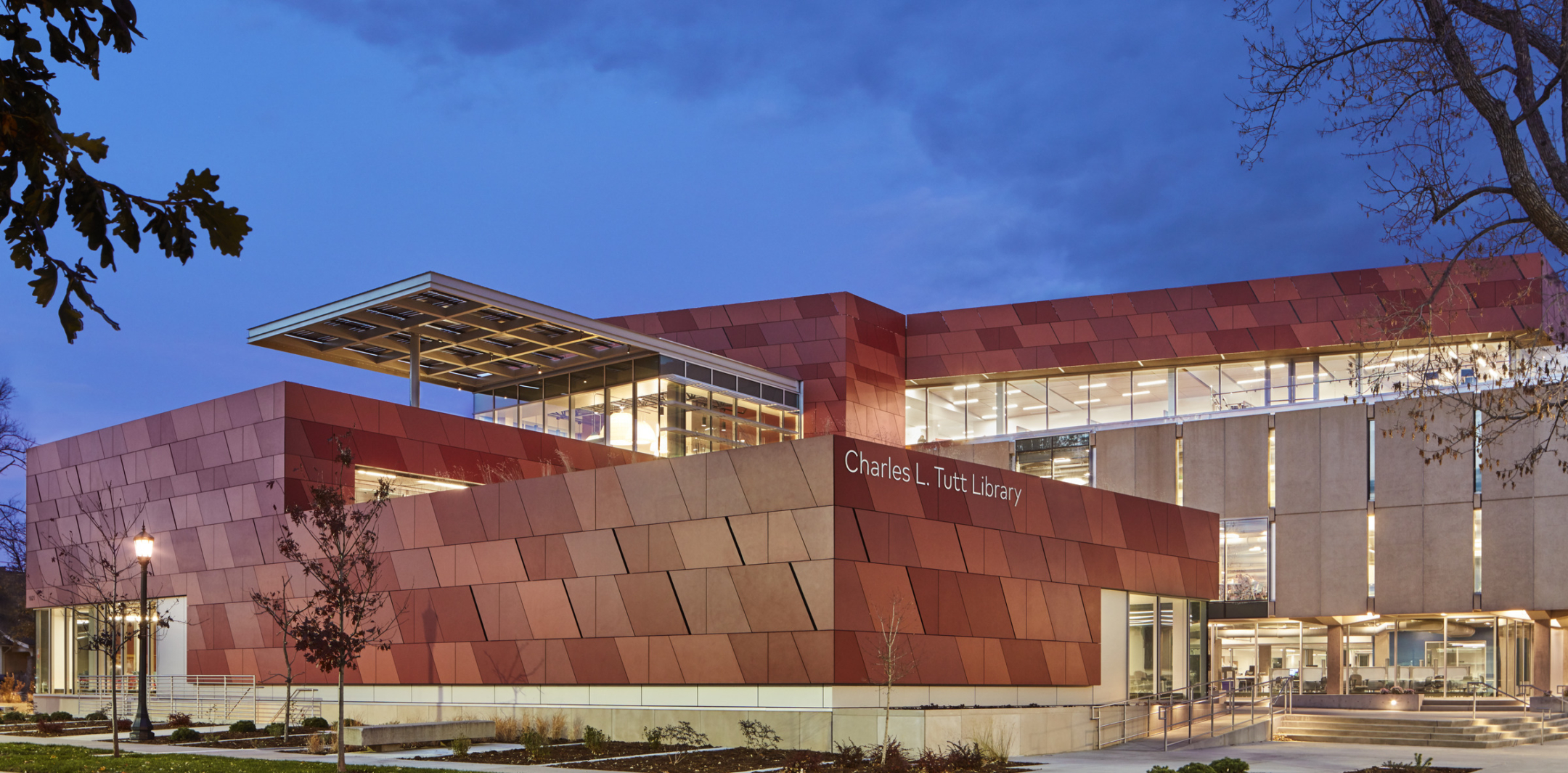 A double-height glass wall invites the school’s pre-existing courtyard into the new library and media center.