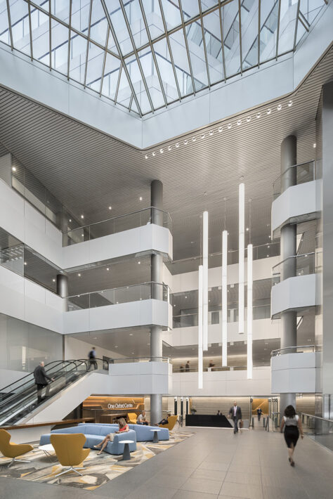 The redesign is focused on the plaza, lobby, and underperforming retail spaces located on the lowest podium levels of the building. To appeal to prospective tenants, the design team created a new co-working “urban room”— a grand, active space that serves both the building tenancy and the immediate neighborhood as a central meeting and gathering hub.