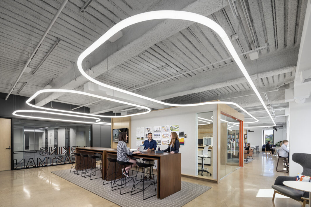 This efficient space realizes a 34-percent reduction in embodied carbon compared to similar work environments. This reduction results from a minimalist design approach, constructing walls only where necessary, eliminating extraneous elements such as bulkheads and drywall, and sourcing materials from local vendors and manufacturers to reduce transportation-related emissions. The materials we chose, furthermore, were vetted for the health of their contents and the transparency of their manufacturing process.